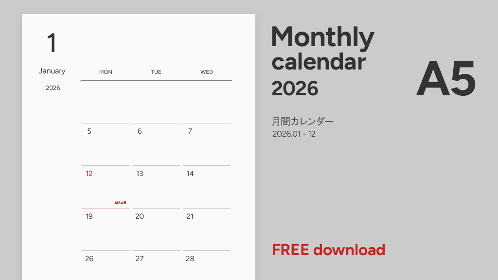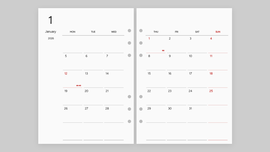 手帳リフィル┃ マンスリーカレンダー 2026 / 1月始まり / A5 / 無料ダウンロード